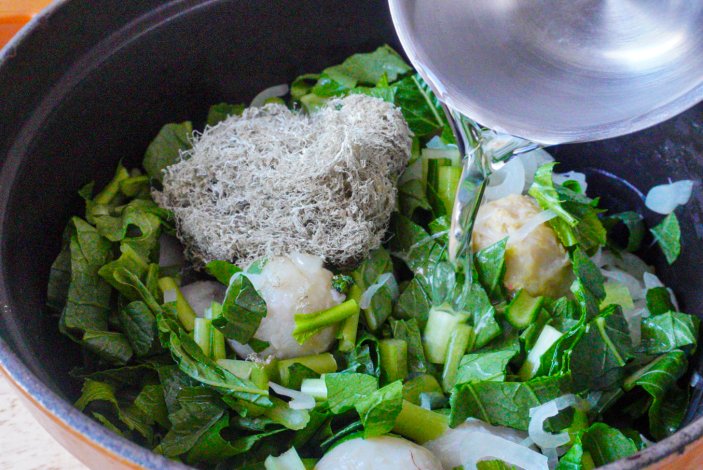 4. とろろ昆布と一緒にコトコト煮る。お鍋に具材と「とろろ昆布」を合わせ、旨みをじっくり引き出しながら煮込みます。