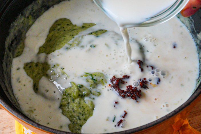 ・再び弱火にかけ、味噌と牛乳または豆乳を加え、全体を温めながら味を見る。