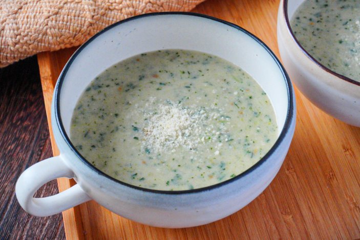 7.仕上げの魔法をパラリ。器に盛り、仕上げに粉チーズをふりかければ、香り豊かなポタージュの完成です!