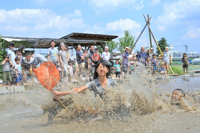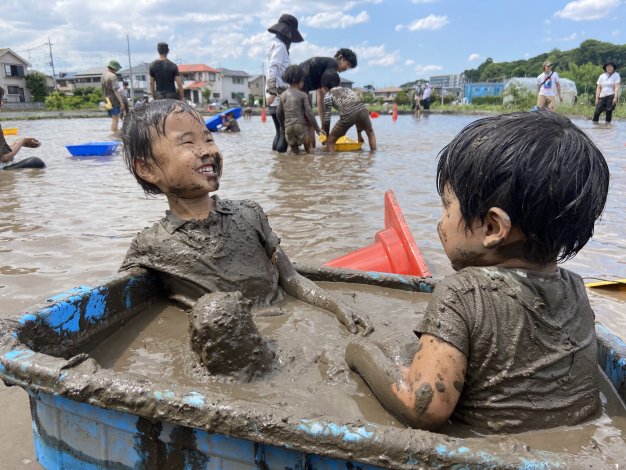 一方で、子供たちには毎年6月、田植え前に泥遊びを思い切り楽しむ「くにたちどろまみれ」という祝祭があります。200人以上が集まり、文字通り泥に「浸かる」ほどの豪快なイベントです。